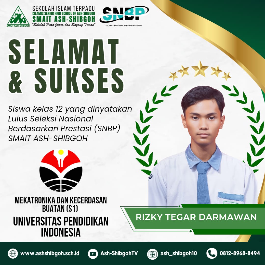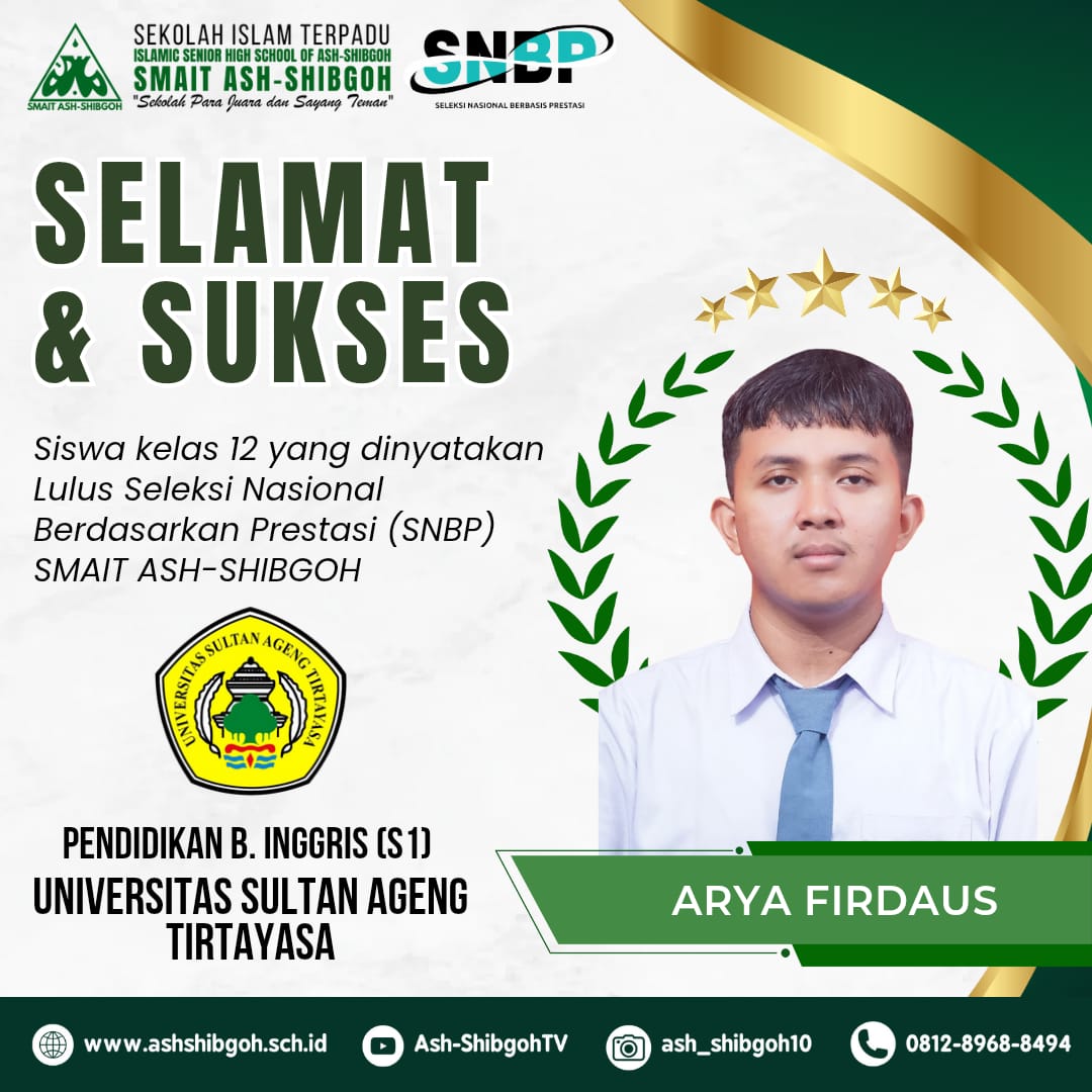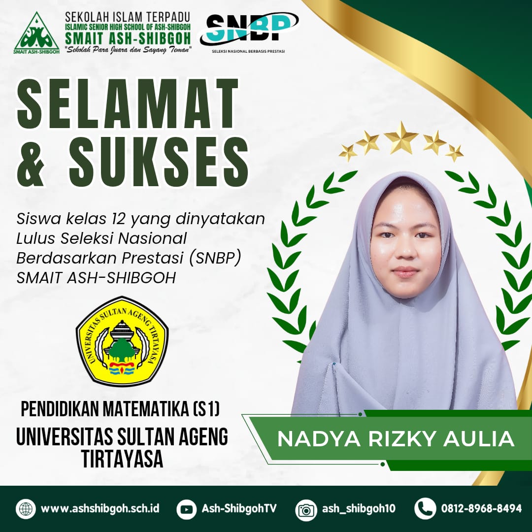 Alhamdulillah, setiap tahun siswa SMAIT Ash-Shibgoh selalu ada yang lolos jalur undangan ke perguruan tinggi negeri. Tahun ini di antaranya ke UNTIRTA, UPI, UB, UIN, UNDIP, dan UNSOED. Semoga menjadi motivasi bagi adik-adik kelas untuk terus berprestasi.